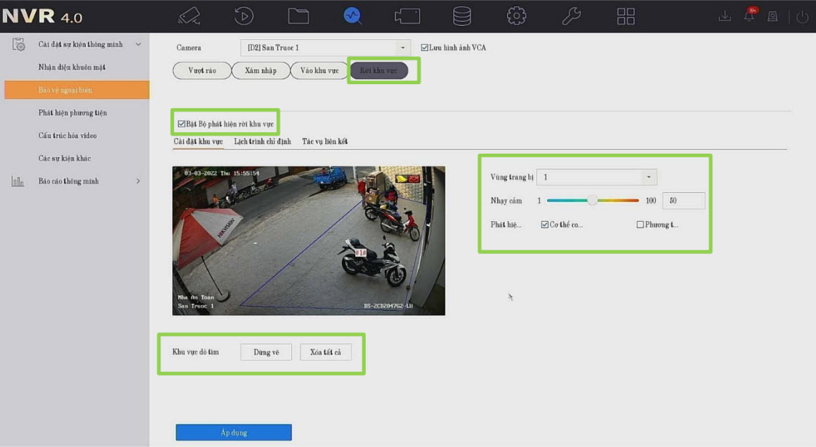 đểvào cài đặt các sự kiện thông minh --> Chọn Bảo vệ ngoại Biên--> Chọn Rời khu vực