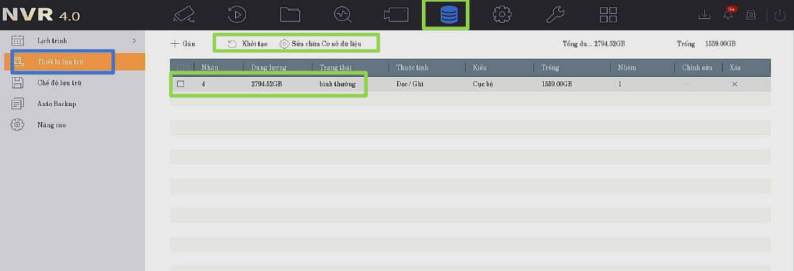 Sữa chưa dữ liệu ổ cứng: Chọn ổ cứng --> chọn Sửa chưa cơ sỡ dữ liệu (cho trường hợp xem từ xa không được hoặc mới update Firmware lên cần sửa chữa dữ liệu).
