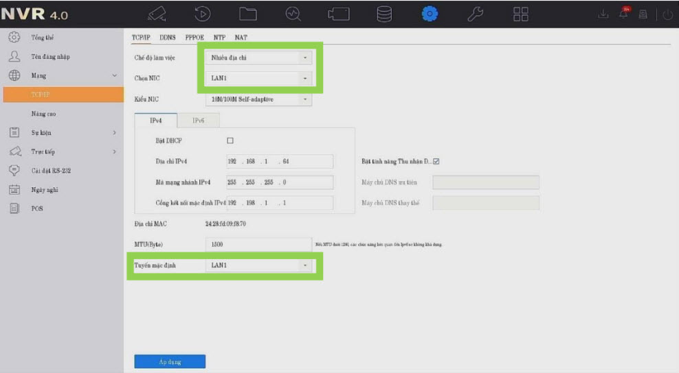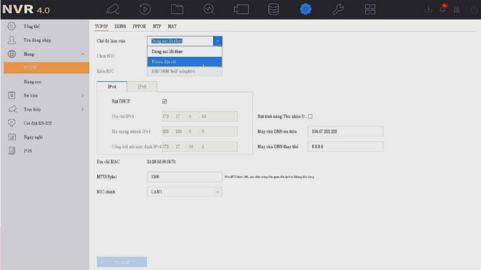 Chế độ Nhiều địa chỉ: Dùng cho hệ thống chạy 2 lớp mạng khác nhau (1 cổng cho camera nội bộ, 1 cổng cho ra hệ thống ngoài hoặc internet). Chọn NIC rồi đặt địa chỉ IP.