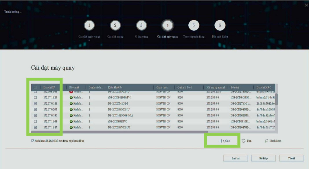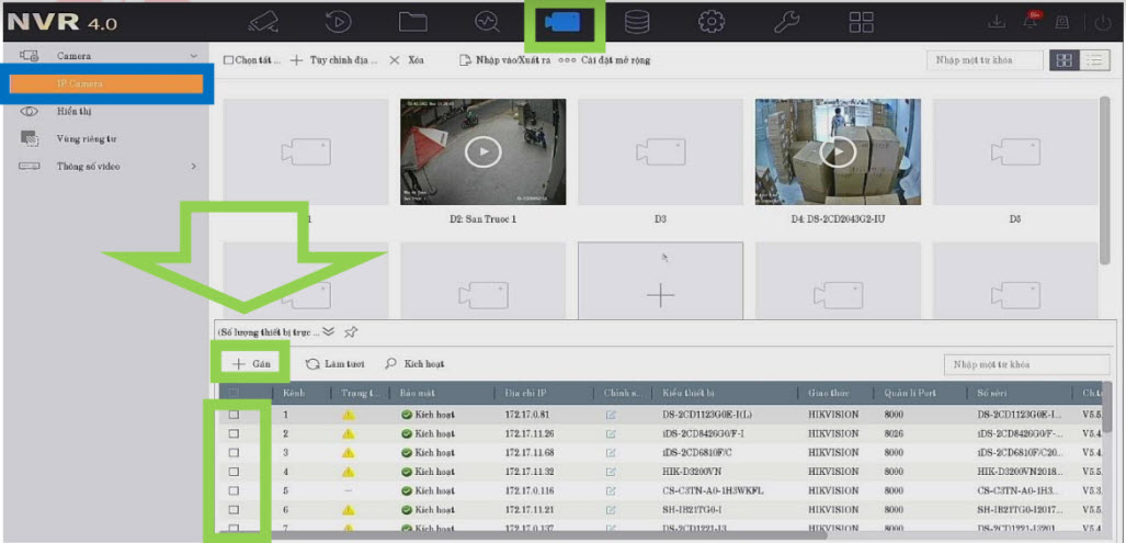Chọn các camera --> Chọn Gán --> Đầu ghi sẽ tự động kích hoạt các camera và gán vào đầu ghi.