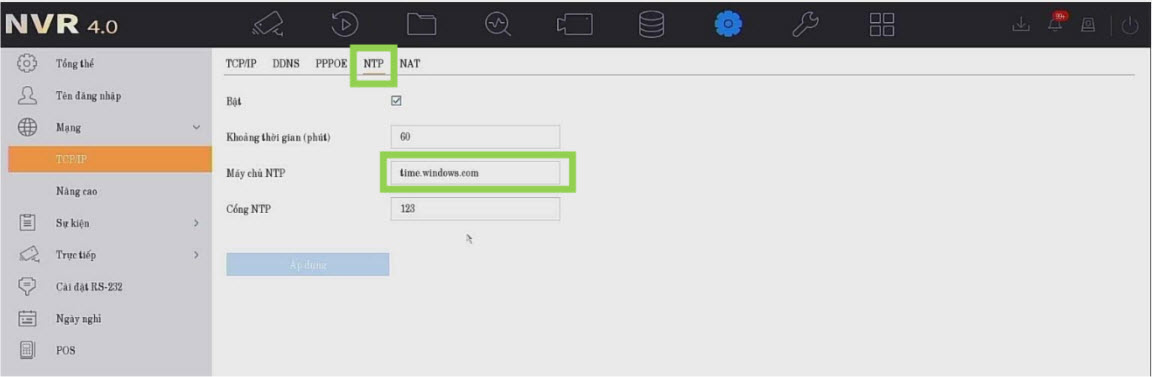 Bật NTP --> điền Server là time.windows.com rồi chọn áp dụng