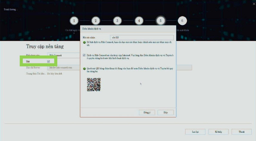 Bật Hik-connect. Chọn vào chữ Bật --> tạo mã xác nhận rồi tích chọn như hình dưới