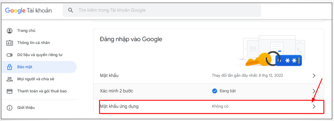 Khi đã Bật xác minh 2 bước Thành công , Tiếp theo chọn“ Mật khẩu ứng dụng ”
