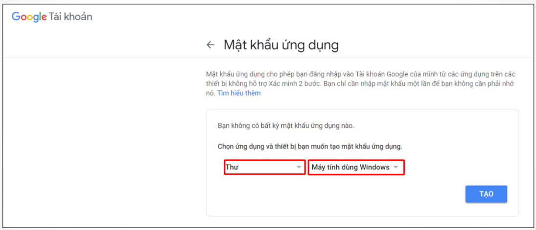 Tiếp theo chọn Ứng dụng và Thiết bị bạn muốn tạo mật khẩu ứng dụng