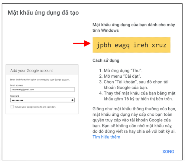 Mật khẩu ứng dụng được tạo, sử dụng mật khẩu này để thiết lập trên thiết bị Hikvision