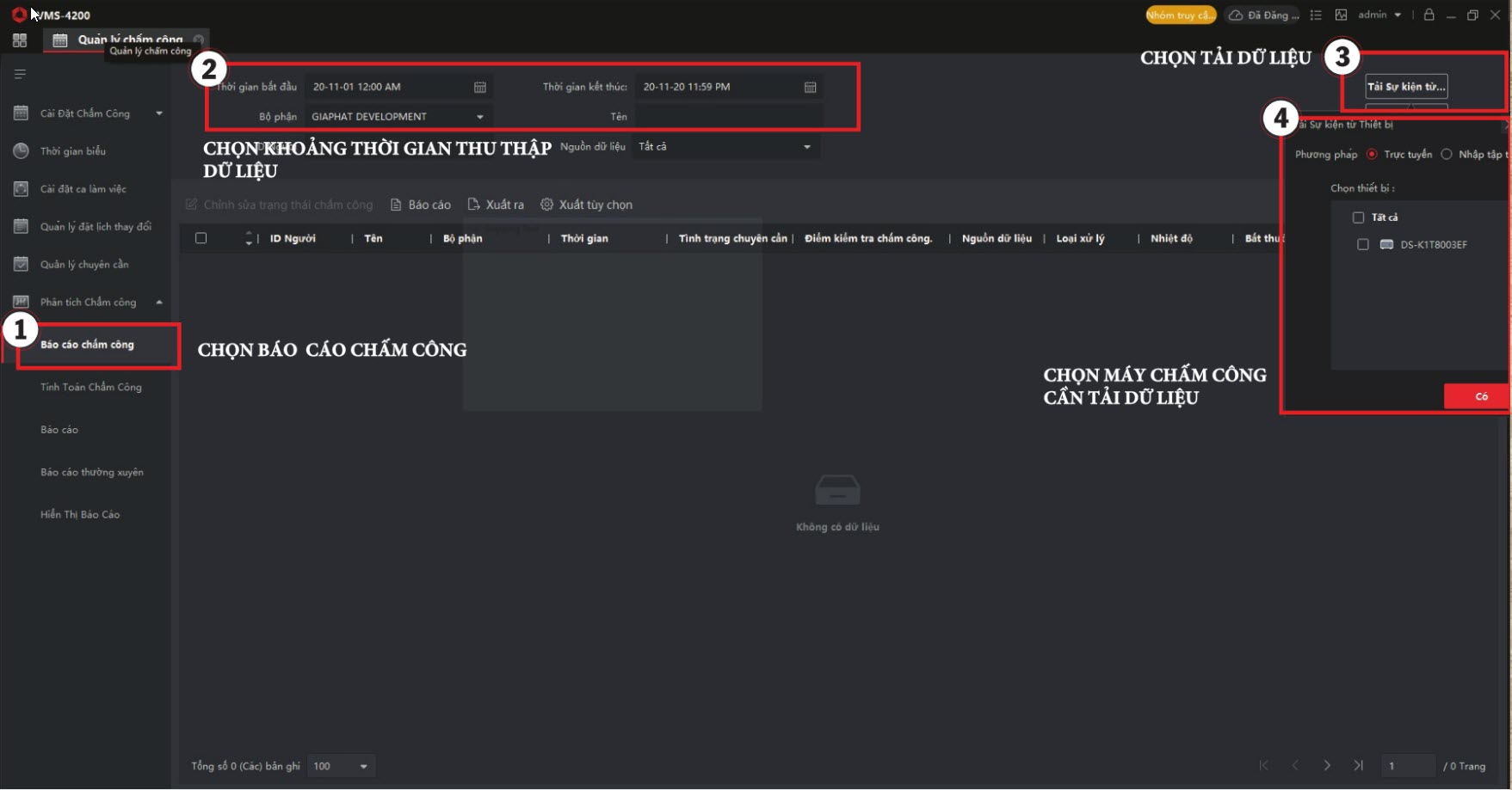 Cuối cùng, sau khi đã thiết lập xong các thông số mong muốn, bạn chỉ việc chọn tải lên từ thiết bị để máy chấm công Hikvision bắt đầu quá trình xuất ra các báo cáo liên quan. Qua đó, bạn có được toàn bộ thông tin về việc điểm danh của nhân viên trong suốt một khoảng thời gian đã xác định.