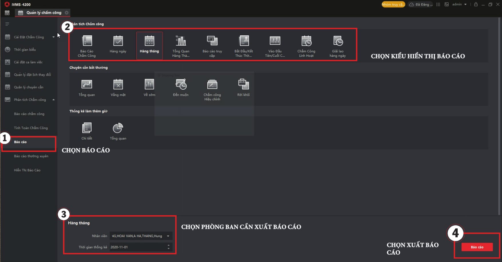 Sau khi đã vào được hệ thống, người sử dụng sẽ tiếp tục chọn các tính năng liên quan đến phân tích và báo cáo chấm công. Đây là những công cụ giúp bạn có cái nhìn tổng quan và chi tiết về tình hình điểm danh của nhân viên.