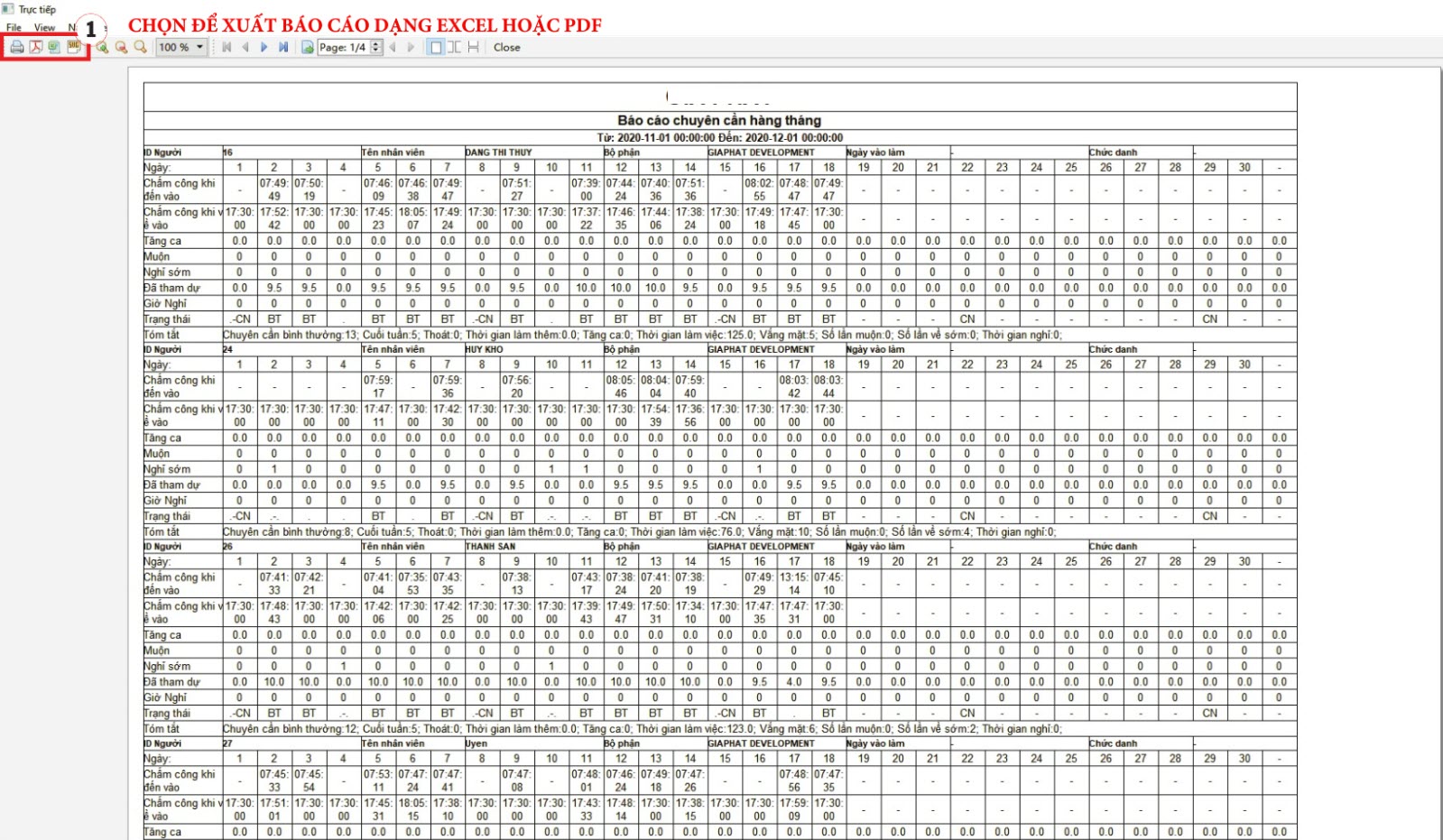 Báo cáo hàng ngày / hàng tháng: Hiển thị tổng hợp thời gian làm việc, công làm trong một tháng, số lương giờ tăng ca trong tháng.