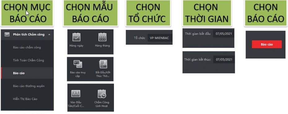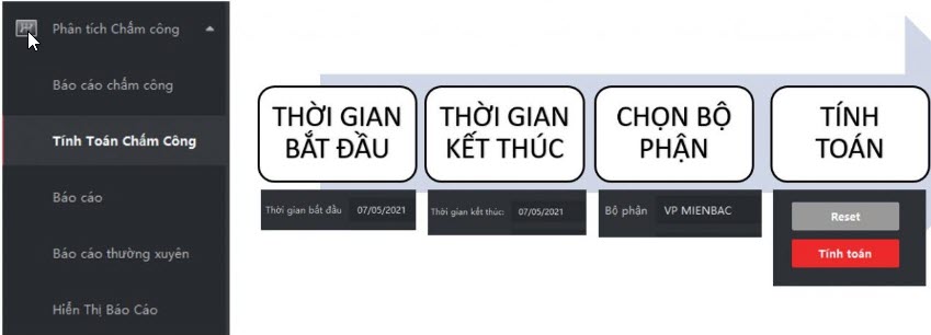 Người sử dụng vui lòng chọn: Quản lý chấm công / Phân tích chấm công / Báo cáo chấm công :