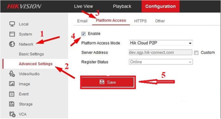 Bước 1: Truy cập vào địa chỉ IP của đầu ghi, vào mục Configuration kiểm tra dịch vụ P2P của Hikvision để biết tình trạng của thiết bị. Hoặc người dùng có thể kiểm tra trực tiếp trên màn hình xem camera của tivi.