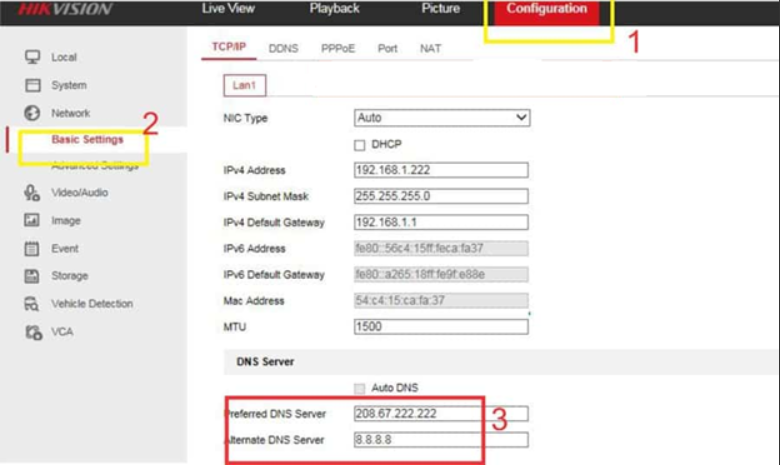 Thỉnh thoảng camera hay đầu ghi Hikvision khi kích hoạt không tự nhận DNS hay truy cập vào thiết bị và cài đặt DNS, cụ thể là: DNS 1: 208.67.222.222 – DNS 2: 8.8.8.8 hoặc kích mục Auto DNS.
