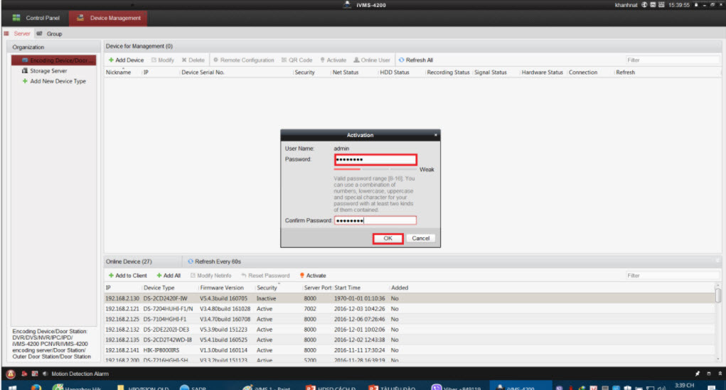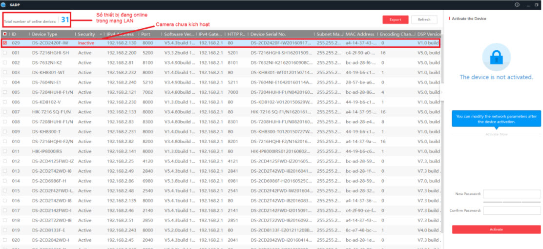 Đối với camera mới của HIKVISION sẽ ở trạng thái “Inactive”. Ta kích hoạt nó lên để sử dụng bằng phần mềm SADP hoặc iVMS-4200.