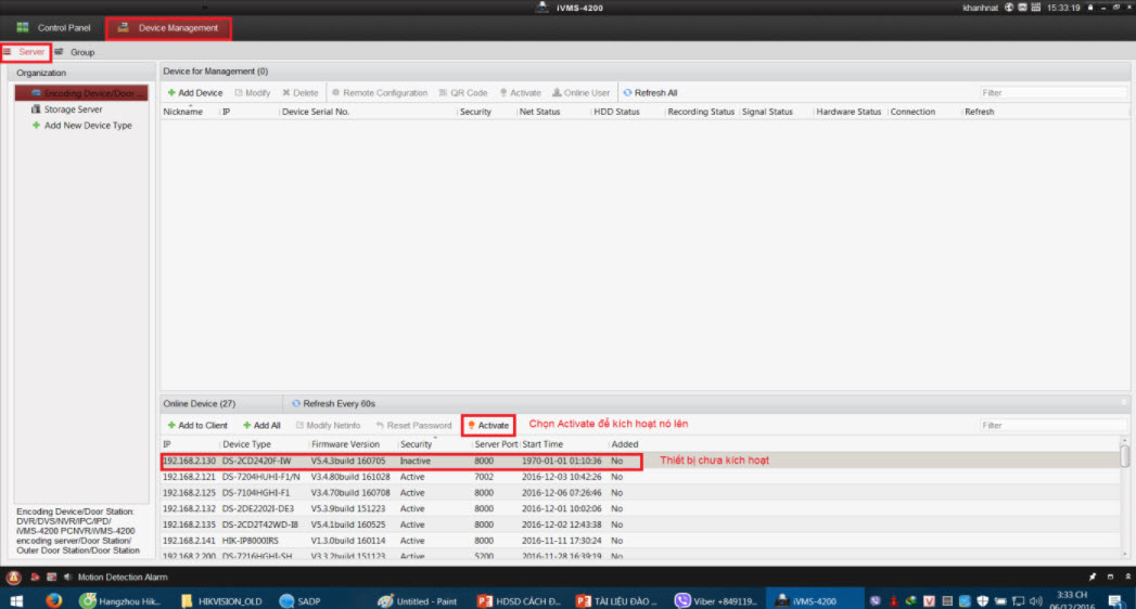 Mở phần mềm iVMS-4200, ta chọn Device management và thao tác như hình.