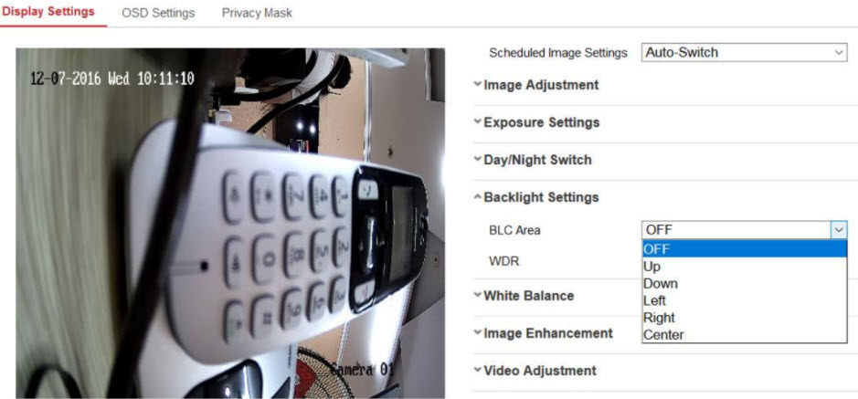 Trong phần Backlight settings BLC Area, ta có thể chọn vùng bật tính năng bù ngược sáng trên khung hình.