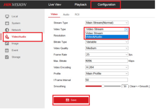 Vào Configuration -> Video/Audio -> Stream Type chọn Main Stream, và Video Type chọn Video&Audio. Sau đó Save lại.