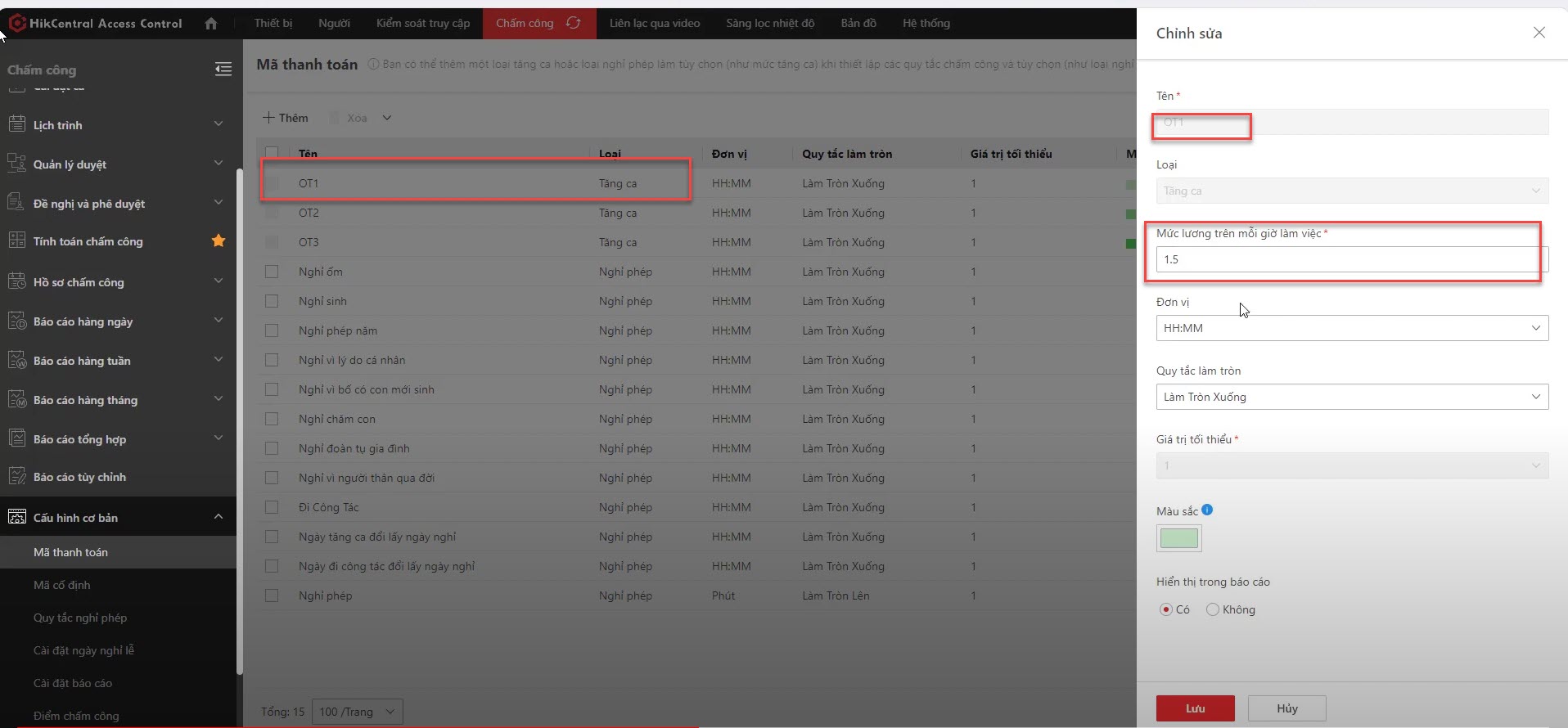 Cấu Hình Overtime (Tăng Ca): Chỉnh sửa mức lương tăng ca để đảm bảo tính toán đúng mức lương cho giờ làm việc ngoài giờ quy định.