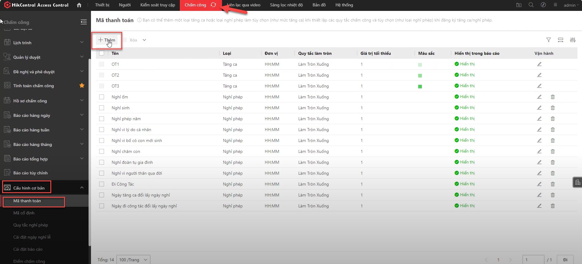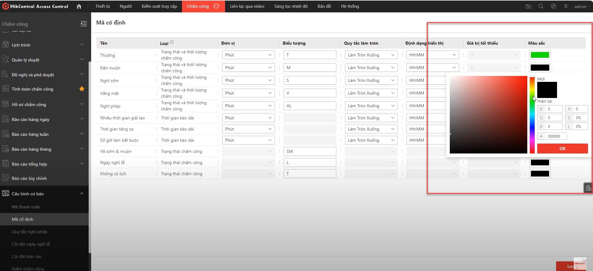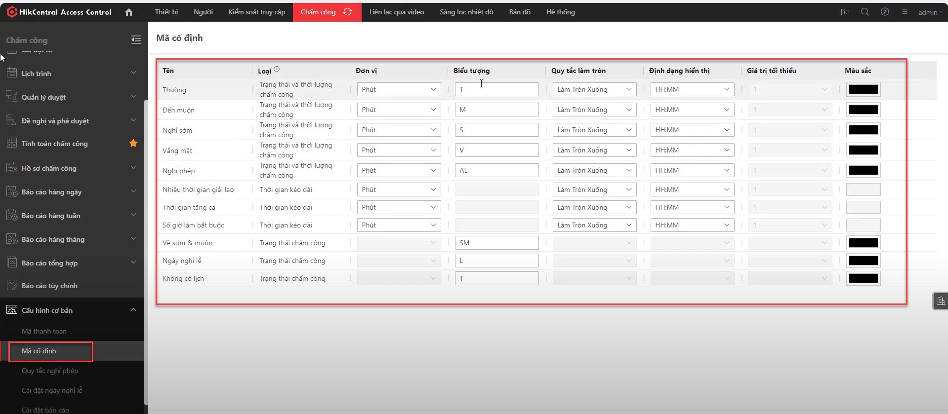 Cấu Hình Mã Cố Định: Chỉnh sửa ký tự nhận biết và màu sắc cho các trạng thái chấm công khác nhau để dễ dàng phân biệt trên báo cáo.