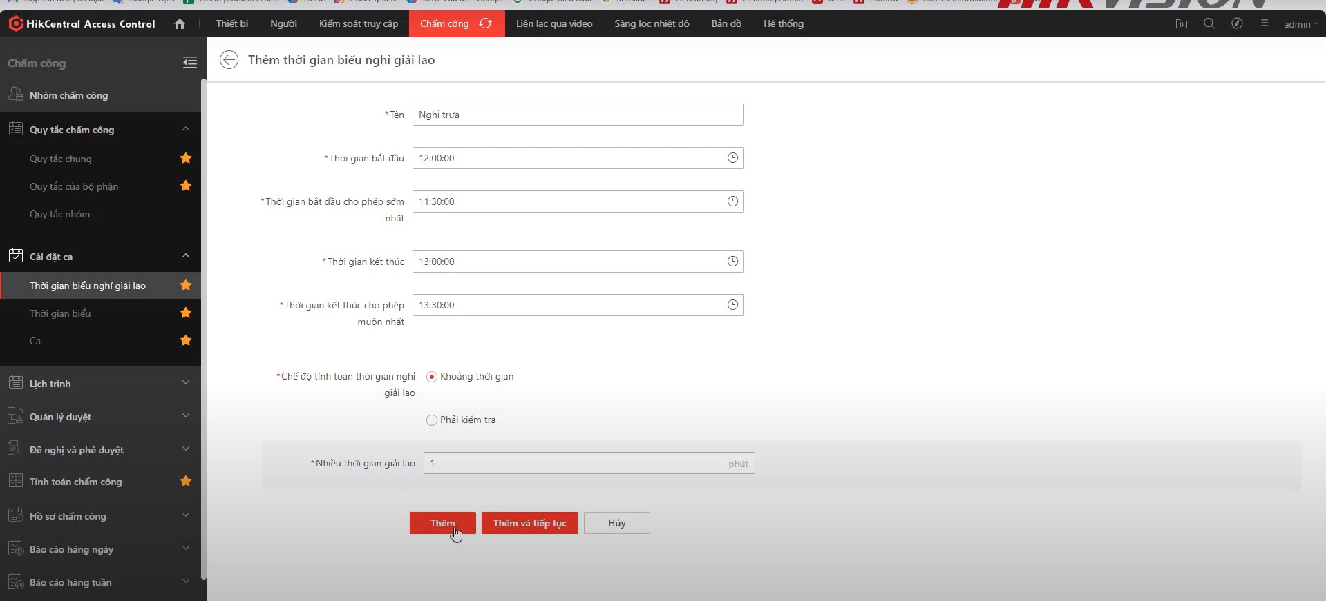 Thiết lập thời gian bắt đầu và kết thúc nghỉ trưa: