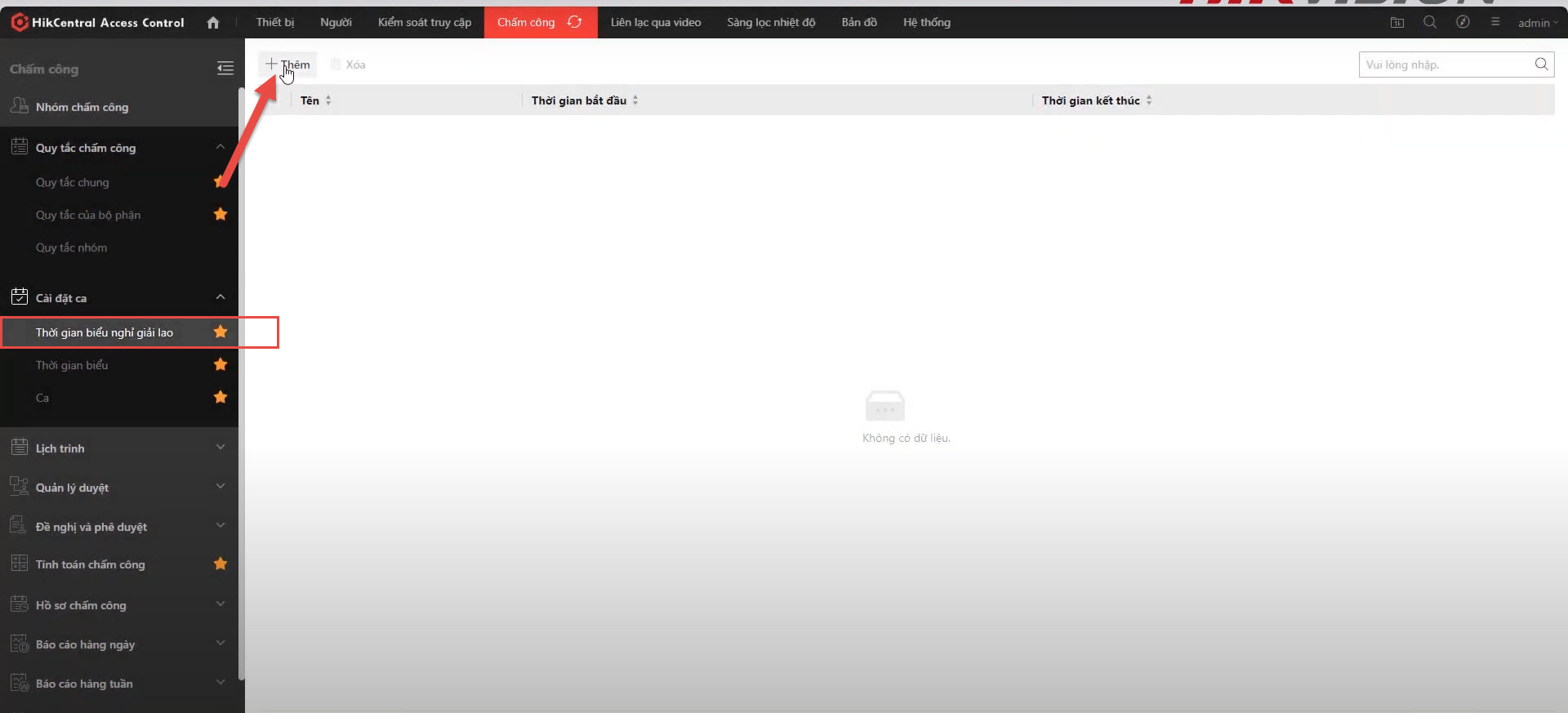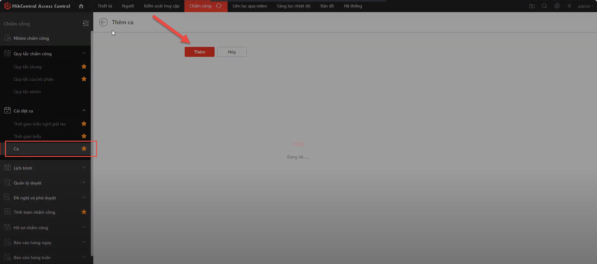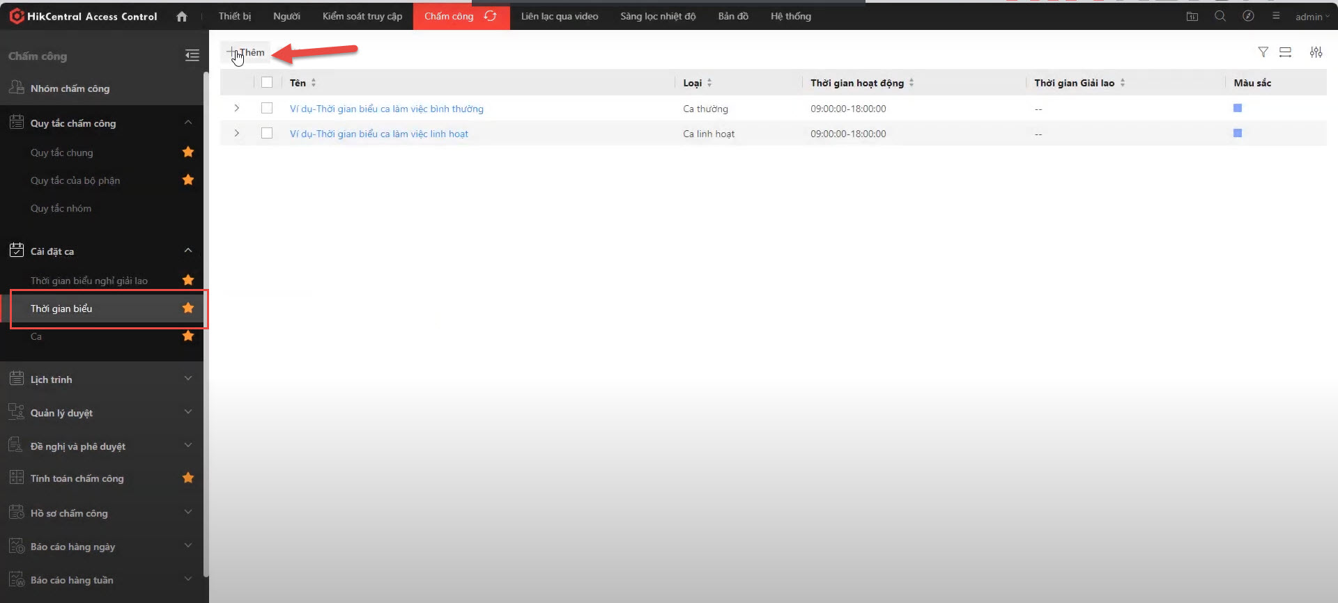 Nhấn nút "Thêm" để tạo một lịch ca mới.