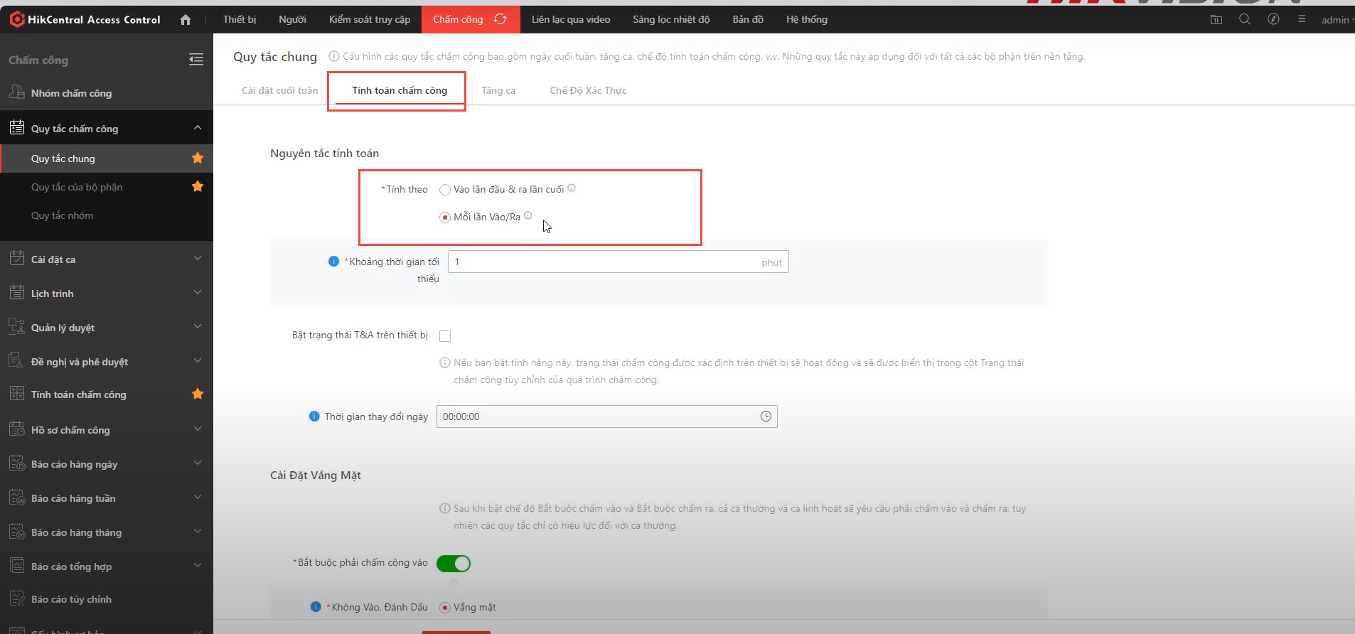 Thiết lập nguyên tắc chấm công (vào lần đầu ra lần cuối hoặc mỗi lần vào ra).