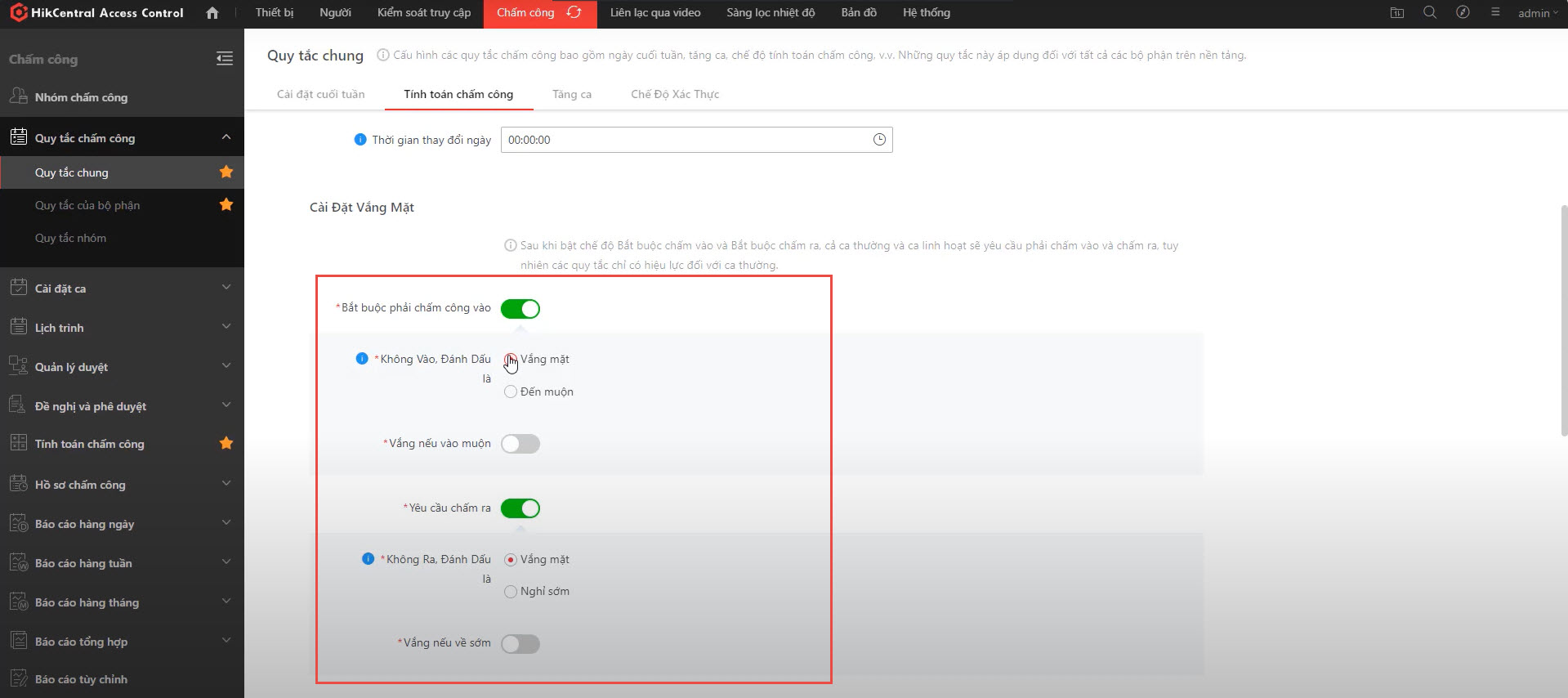 Cài đặt yêu cầu bắt buộc chấm vào/ra và xử lý trường hợp vắng mặt hoặc đi muộn/về sớm.