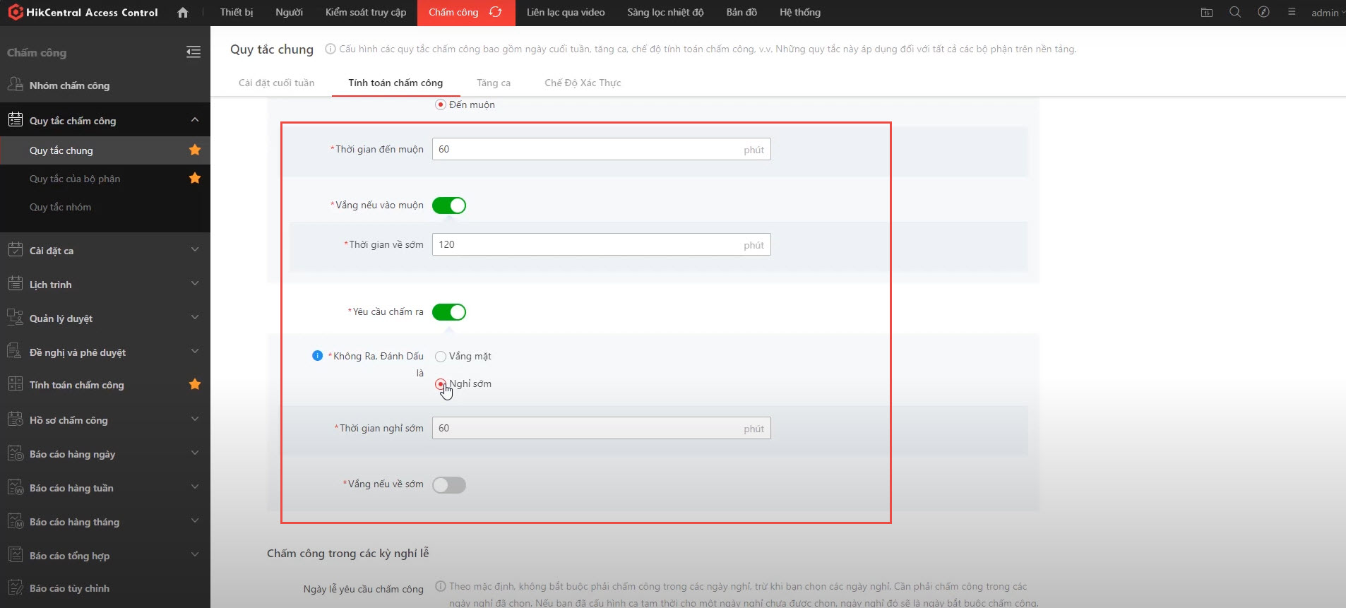 Thiết lập số phút muộn tối đa trước khi tính là vắng mặt (ví dụ: Muộn quá 120 phút sẽ tính là vắng mặt).