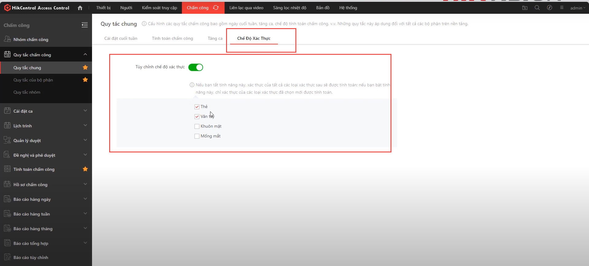 Nếu bật tùy chỉnh chế độ xác thực, chỉ những xác thực bằng các chế độ đã chọn mới được tính toán vào lịch chấm công.