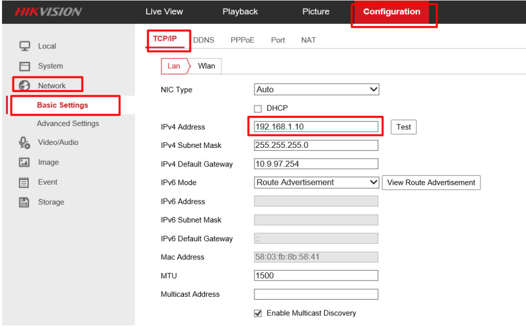 2) Vào Cấu hình > Mạng > TCP/IP. Và sau đó chúng ta có thể kiểm tra IP của mạng LAN. Nó là 192.168.1.10