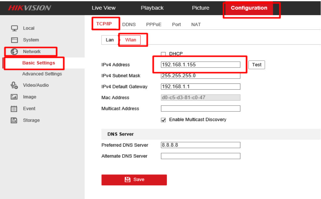 4) Vào Cấu hình > Mạng > Cài đặt Cơ bản > TCP/IP > Wlan. Và sau đó chúng ta có thể đặt IP của mạng VLAN là 192.168.1.155