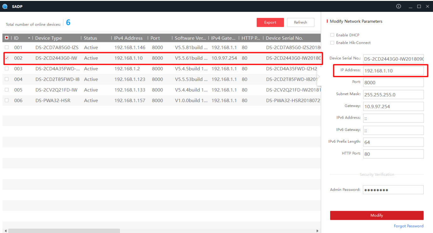 1) Gắn camera và PC vào cùng một bộ định tuyến. Chạy phần mềm SADP và sau đó tất cả các camera IP trong cùng một mạng LAN sẽ được hiển thị trong phần mềm. Đặt địa chỉ IP cho camera (Chẳng hạn như 192.168.1.10)