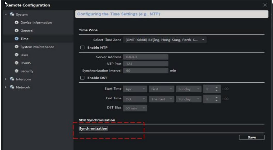Nếu thời gian không chính xác, bạn có thể nhập Remote Configuration của thiết bị>Thời gian >Đồng bộ hóa để đồng bộ hóa thời gian với máy tính