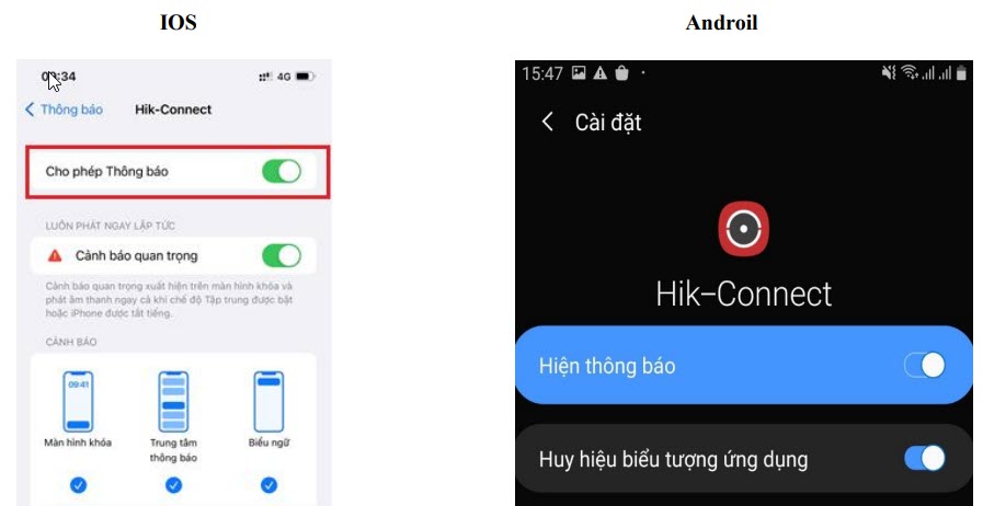 Bật 'Cho phép thông báo': Cài đặt > Thông báo > Hik-Connect Chú ý : Đường dẫn có thể khác nhau tùy các dòng điện thoại