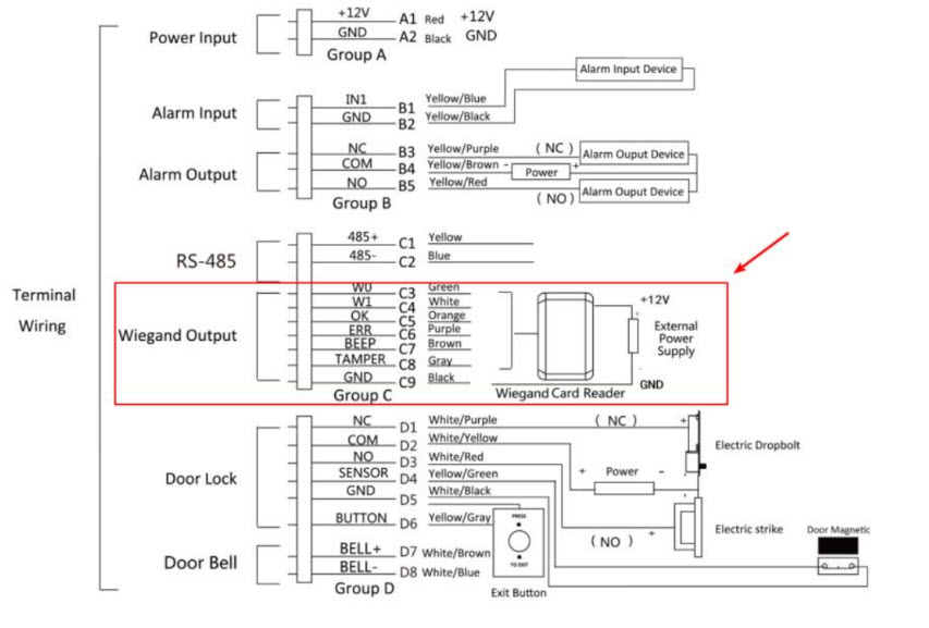 a) Kết nối thiết bị đầu cuối vân tay và đầu đọc thẻ: Sử dụng giao diện Wiegand để kết nối hai thiết bị này. Thực hiện theo chỉ dẫn trong hình bên dưới.