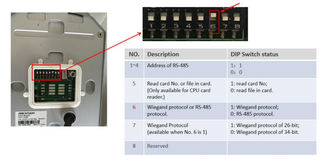 d) Công tắc DIP: đặt công tắc DIP của đầu đọc thẻ thành 0000 0100 có nghĩa là bật giao thức Wiegand.