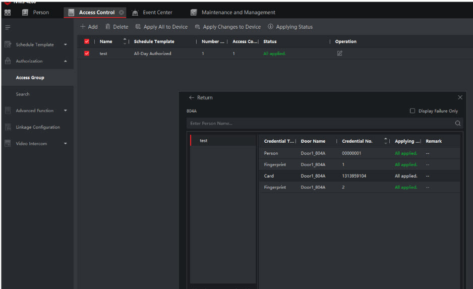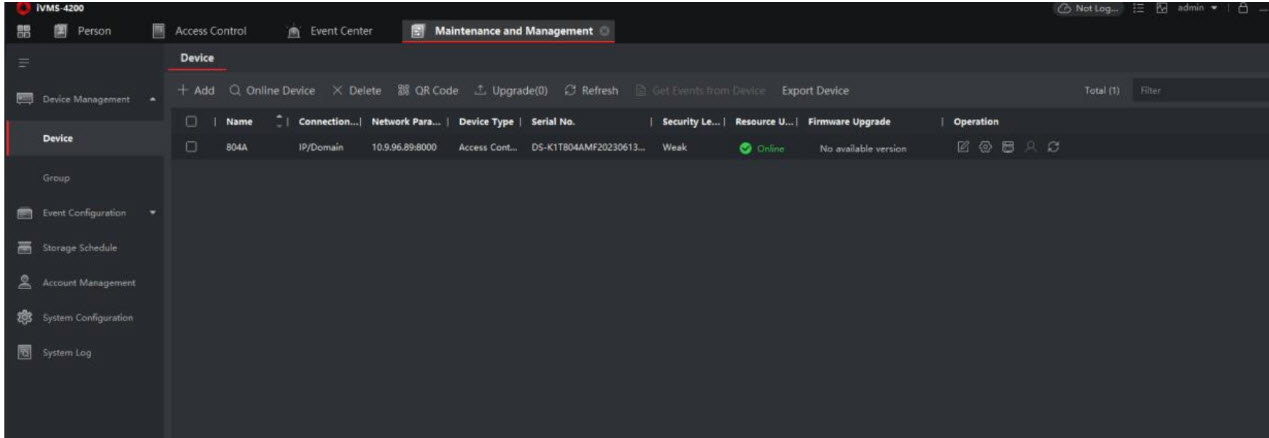 a) Thêm thiết bị đầu cuối vân tay vào nền tảng IVMS-4200. Đảm bảo trạng thái mạng của thiết bị đang trực tuyến