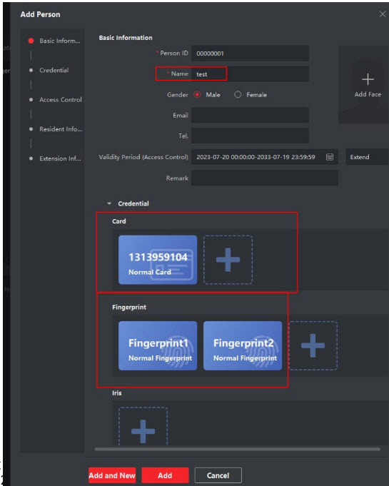 d) Tạo một người, đăng ký dấu vân tay và số thẻ cho người thử nghiệm.