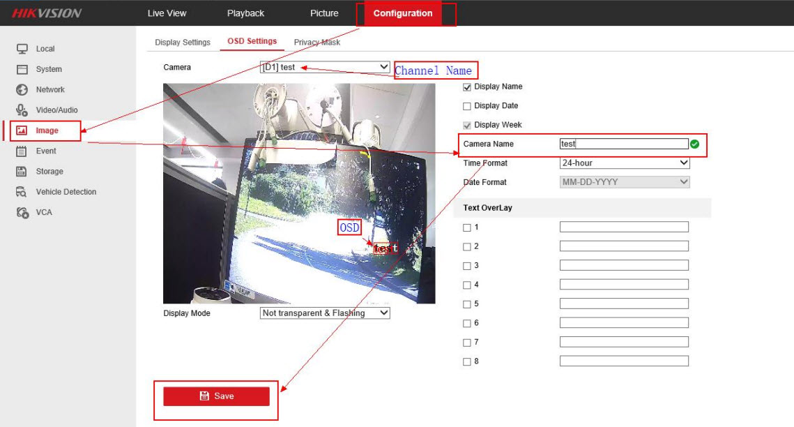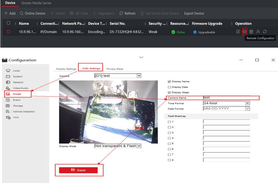 2) Đi tới Quản lý thiết bị -> chọn Thiết bị -> Cấu hình từ xa -> Cài đặt cơ bản -> Hình ảnh -> Cài đặt OSD đặt Tên máy ảnh rồi lưu lại.
