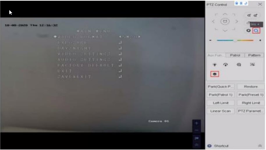 (2) Nhấp vào IRIS+ hoặc MENU để gọi menu OSD của camera