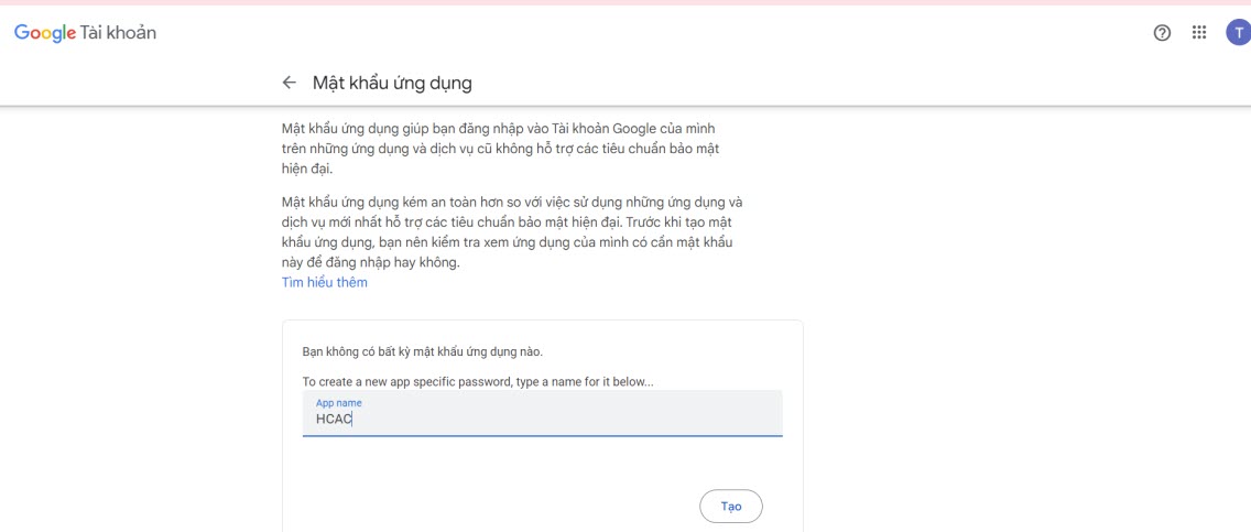 Để lấy được mật khẩu này ta cần tạo một mật khẩu ứng dụng trong mail với các thao tác như sau: