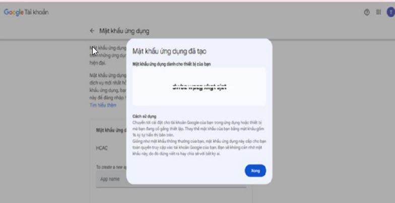 Lúc này mail sẽ cấp một chuỗi mật khẩu ứng dụng cho thiết bị. Ta sẽ coppy và dán vào mật khẩu trong phần cấu hình mail trên Hik Central Access Control.