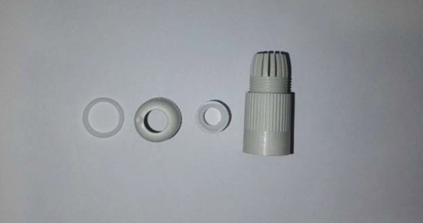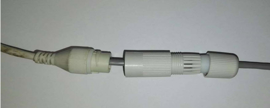 Căn chỉnh các phụ kiện chống thấm nước theo đúng thứ tự: (từ trái sang phải) ổ cắm mạng, miếng đệm loại O, đầu cắm mạng, nắp cuối không thấm nước, miếng đệm cao su không thấm nước, đai ốc khóa, cáp mạng