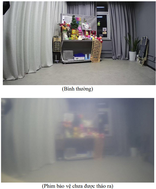 a) Trong quá trình lắp đặt máy, do lỗi của người lắp đặt nên quên bóc lớp màng bảo vệ phía trước ống kính.