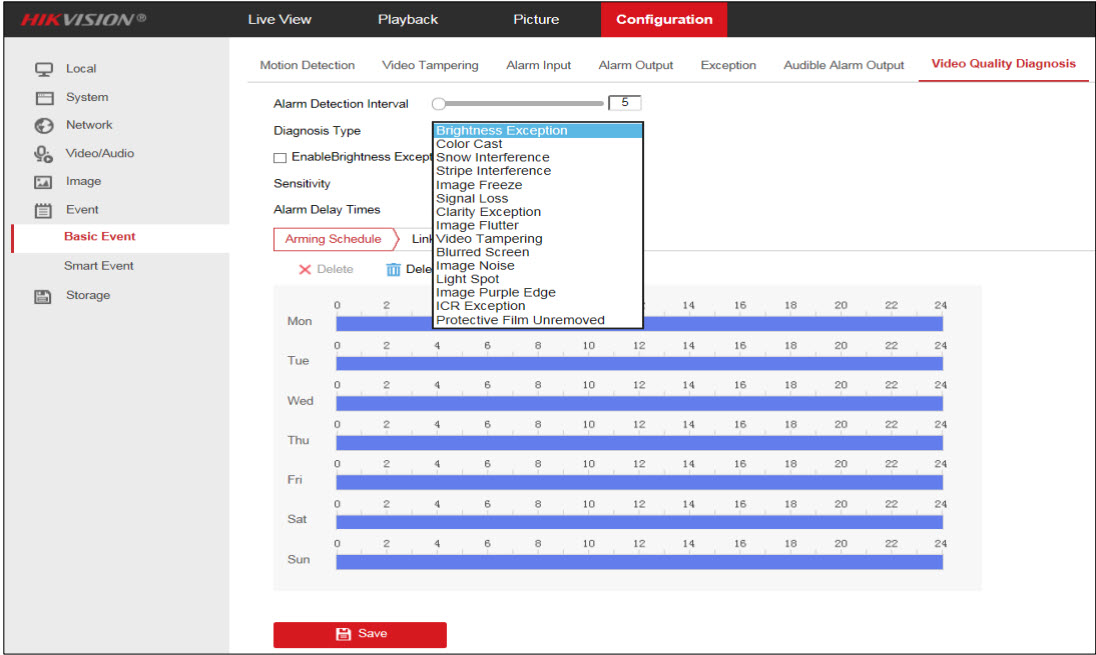 Chức năng Chẩn đoán chất lượng video (Video Quality Diagnosis) mới được thêm vào trong Sự kiện cơ bản (Basic Event) hỗ trợ 15 loại chức năng phát hiện chất lượng video là Ngoại lệ độ sáng (Brightness Exception), Đổ màu (Color Cast), Nhiễu tuyết (Snow Interference), Nhiễu sọc (Stripe Interference), Đóng băng hình ảnh (Image Freeze), Mất tín hiệu (Signal Loss), Ngoại lệ độ rõ (Clarity Exception), Rung hình ảnh (mage Flutter), Giả mạo video (Video Tampering), Màn hình mờ (Blurred Screen), Nhiễu hình ảnh (Image Noise), Điểm sáng (Light Spot), Viền tím hình ảnh (Image Purple Edge), Ngoại lệ ICR (ICR Exception), Phát hiện phim bảo vệ chưa được tháo ra (Protective Film Unremoved detection).