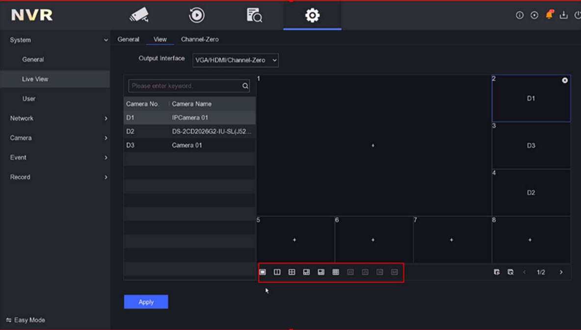 Nhấn vào Apply để lưu cài đặt. Bạn cũng có thể nhấp và kéo camera đến cửa sổ mong muốn trên giao diện Live view để đặt thứ tự.