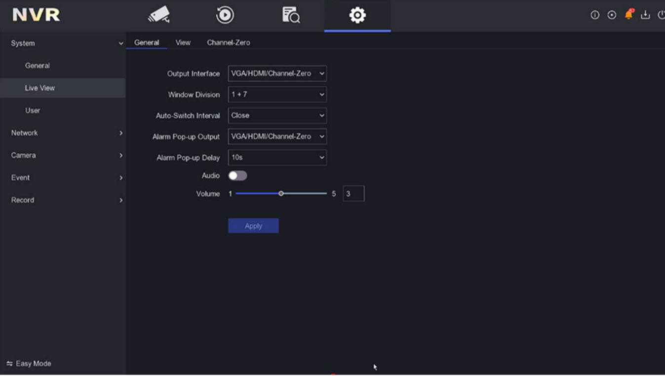 Thứ tự mặc định xem trực tiếp các camera trên màn hình cục bộ được xác định bởi thứ tự thêm camera. Cài đặt Live View có thể được tùy chỉnh theo các nhu cầu khác nhau. Bạn có thể cấu hình giao diện đầu ra, thời gian dừng hiển thị, tắt tiếng hoặc bật âm thanh, vị trí kênh, v.v..