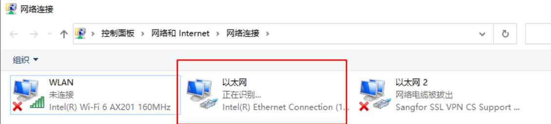 Sử dụng nguồn điện 12V bên ngoài, kết nối camera trực tiếp với máy tính thông qua cáp mạng và kiểm tra trạng thái mạng của máy tính. Thông thường, sau khi máy tính được kết nối với cáp mạng, trạng thái kết nối mạng sẽ hiển thị "Đang nhận dạng" để cho biết mạng đang được kết nối đang được nhận dạng, như trong hình sau.
