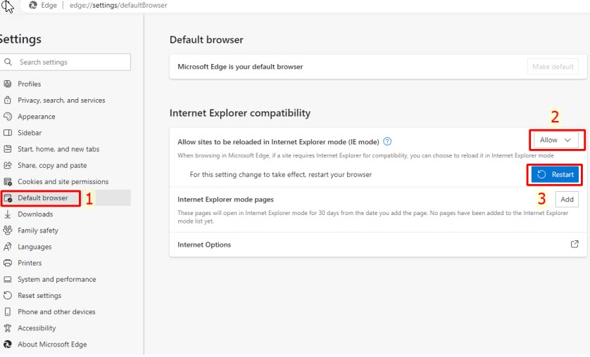 Đi đến Default browser --> tùy chỉnh mục Allow sites to be reloaded in Internet Explorer mode (IE mode) thành Allow --> chọn tiếp Restart để khởi động lại trình duyệt