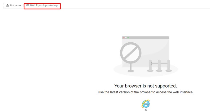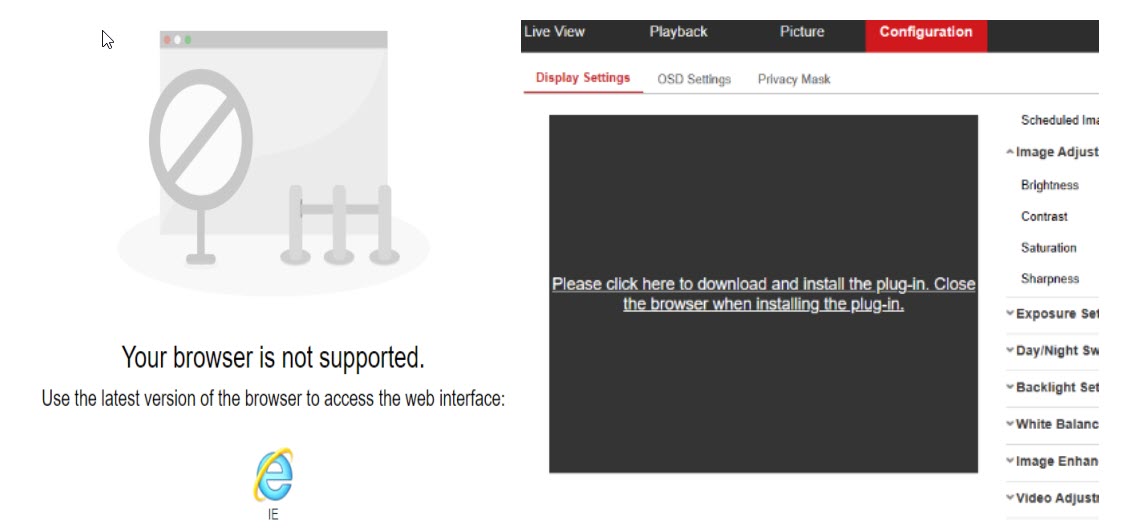 Mô tả vấn đề: Đối với các thiết bị đời cũ, để xem trực tiếp, phát lại hoặc cấu hình thiết bị cần thao tác trên Internet Explorer, tuy nhiên từ Windows 10 trở lên, Internet Explorer đã không còn hoạt động và được thay thế bằng Microsoft Edge. Khi truy cập các thiết bị này trên trình duyệt mới sẽ gặp thông báo lỗi “Your browser is not supported” hoặc yêu cầu tải và cài đặt Plug-in như bên dưới: