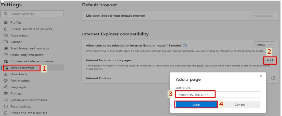 Truy cập đến Settings --> Default browser --> Add --> nhập địa chỉ IP của thiết bị theo cấu trúc --> click chọn Add --> truy cập lại địa chỉ IP trên trình duyệt và sử dụng tiếp tục