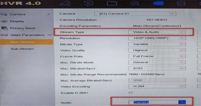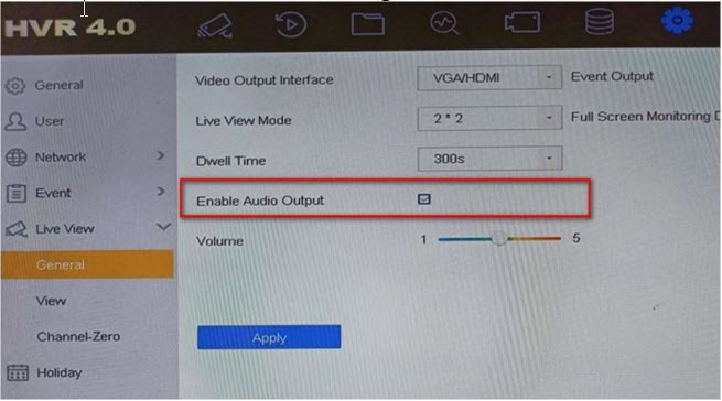 Đăng nhập vào giao diện cục bộ của DVR, vào OSD và bật chức năng âm thanh của camera.